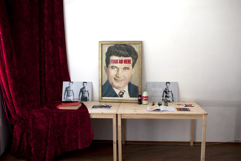 În cealaltă cameră am găsit instalația lui Alex Gâlmeanu, care prezintă ideea că tehnicile propagandei comuniste de promovare a liderului suprem sunt folosite azi de publicitate în promovarea consumerismului. Instalația cuprinde 8 obiecte,simboluri ale paradoxului. Mi-au rămas în minte :