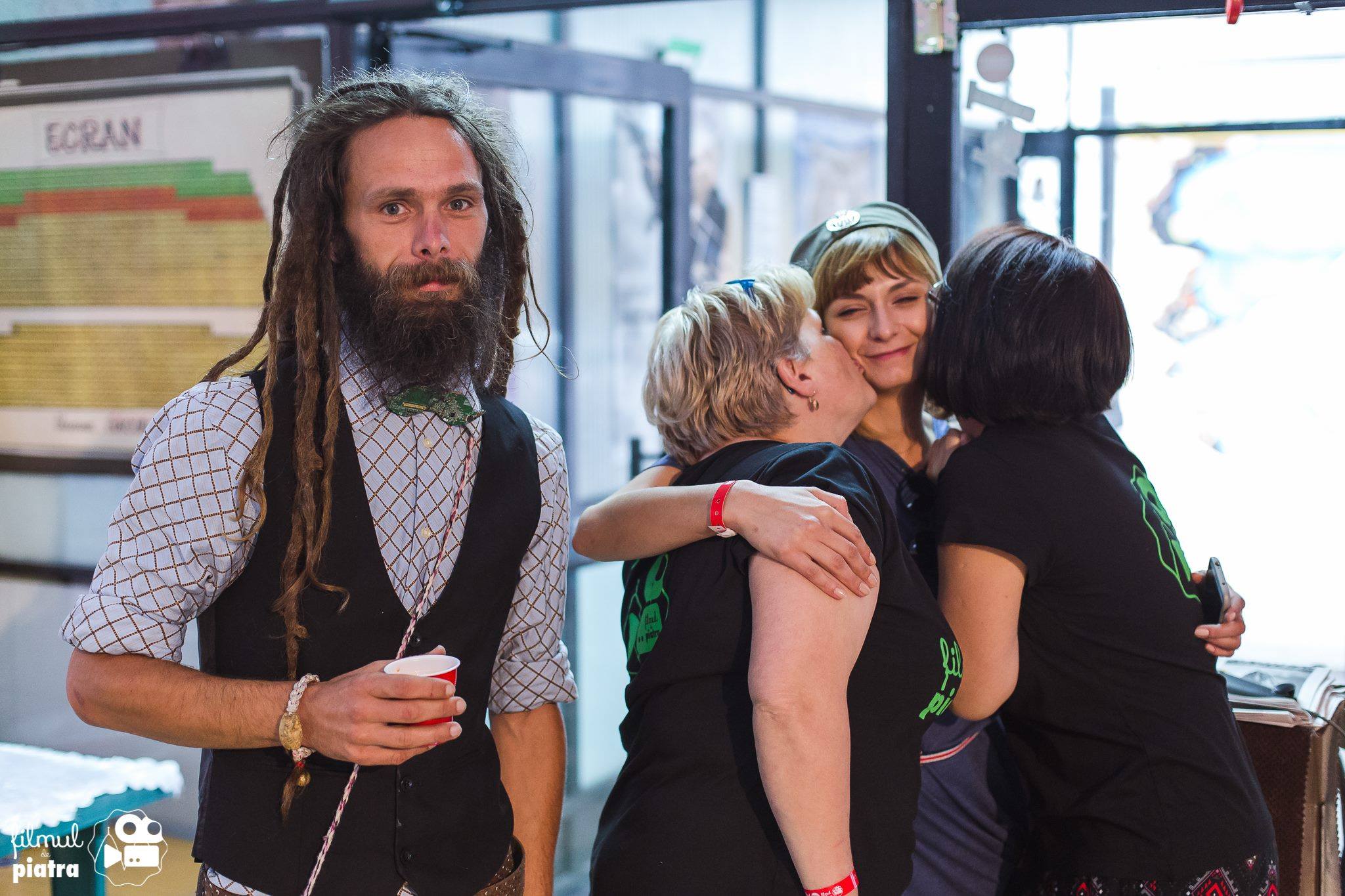 O mare parte din energia de zilele astea s-a datorat voluntarilor – de vineri seara de când am ajuns am fost luată cu asalt de disponibilitatea și prietenia lor, de felul în care radiază de fericire că se întâmplă ceva mișto și-n Piatra și modul natural în care se bagă în vorbă și strâng mâna ferm când fac cunoștință. Sunt geloasă, recunosc, pentru că pare că viața voluntarului la festival e un fel de super special upgrade la statutul spectatorului – Alex și Patricia (voluntarii mei preferați, pentru că n-am cum să nu fiu subiectivă - n.red: Alex Petrican e și la Plic, o revistă) îmi povestesc despre serile la cazarea de la ștrand, unde se culcă după patru pentru că toți de la căbănuțe stau afară într-un frig crunt și râd și pun muzică, iar a doua zi sunt totuși perfect odihniți și puși pe treabă. Îi văd la proiecții cum se comportă și mă molipsesc de starea lor de bine – își îndeplinesc îndatoririle împreună și din exterior pare că se distrează copios și când aduc baxuri de apă. Să-i observi cum zburdă între locațiile festivalului te face să-ți scrâșnești dinții de ciudă și să-ți promiți că anul viitor vei aplica și tu ca voluntar.